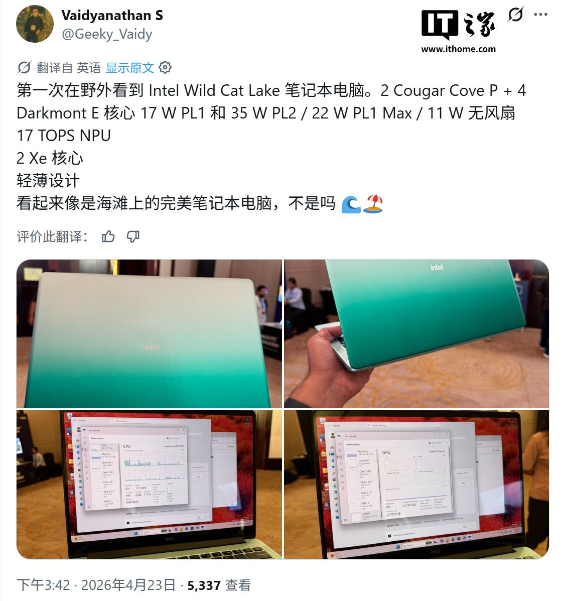 IT之家 4 月 25 日消息,科技媒体 NoteBook Check 于 4 月 23 日发布博文,近距离体验了搭载英特尔 Wildcat Lake 处理器的参考设计笔记本网上配资平台,主要面向无需高性能计算的轻薄本市场。
